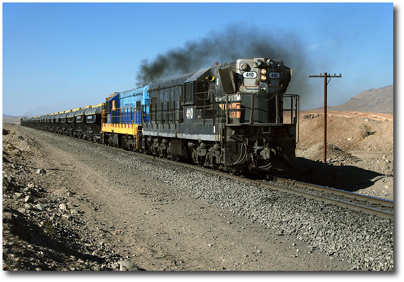 #410 in the classical Ferronor color scheme heads a loaded ore train together