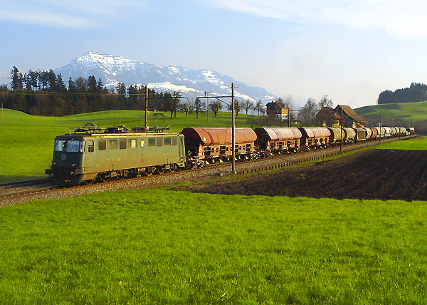 Ganz ordentliche Güterlast eingesammelt hatte am 2. April 2004 diese Ae 6/6 mit dem Nahgüterzug 63240 Erstfeld - Rotkreuz bei der Blockstelle Brüglen kurz vor Rotkreuz.