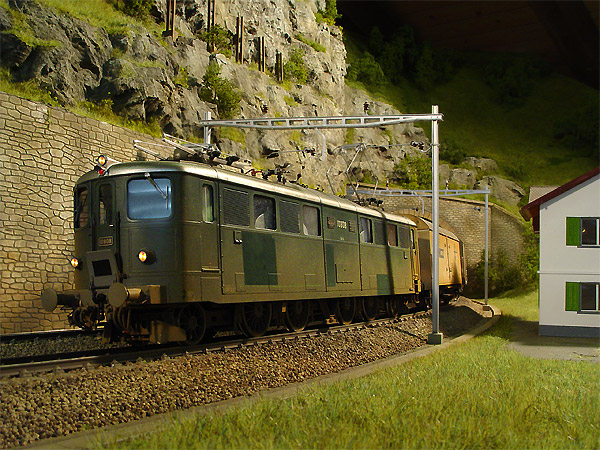 eine Szene mit einem Bahnwärterhaus der Gotthardbahn, welche von der Ae 4/6 10808 mit einem Schnellgutzug passiert wird. Wirkt die