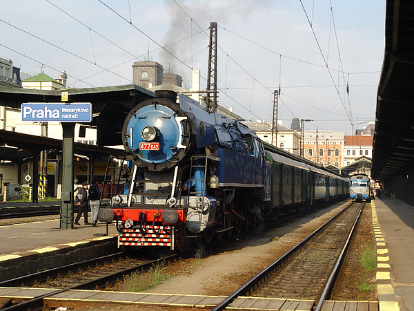 ausgerüstete Tenderlok war sie weltweit einzigartig. Mit einem Museumszug wartet sie am 1.5.2005 in Praha