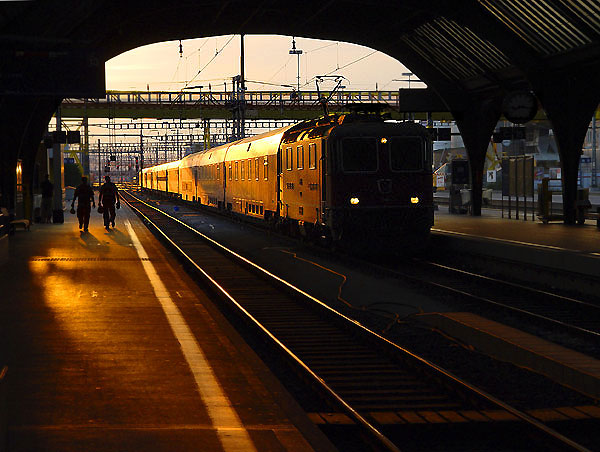 die Perrons der Bahnhofshalle des Zürcher Hauptbahnhofs und tauchte den Nachtzug in