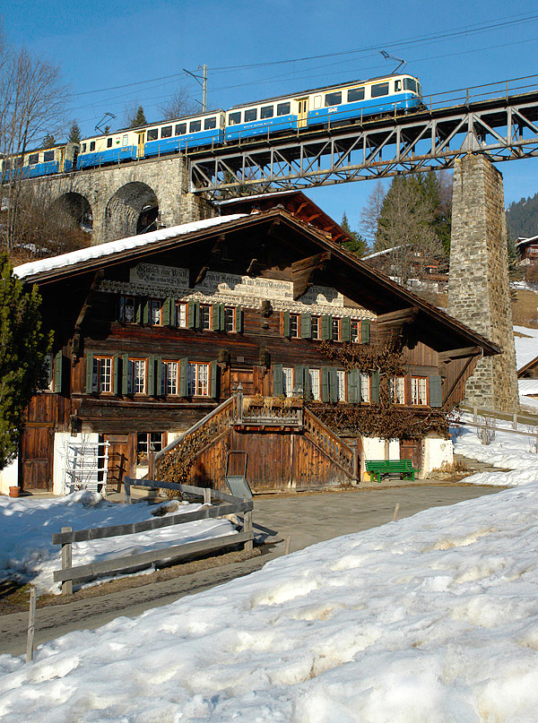 Was ist interessanter - Brücke oder Bauernhaus? MOB ABDe 8/8 auf dem Grubenbachviadukt bei Gstaad. 03.02.2006