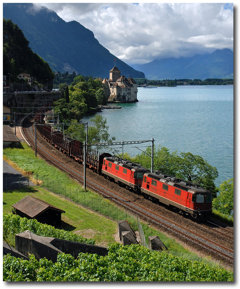 mit den zwei Re 4/4 am Schloss Chillon vorbeirauschte.