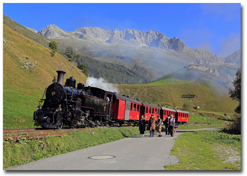 Zeitreise in die Vergangenheit: Für drei Tage kehrten Anfangs September Dampfzüge auf die Furka Bergstrecke, wie sie zu regulären Dampfzeiten bis 1942 auf der FO verkehrten. Mehr dazu hier. Realp, 10.September 2012