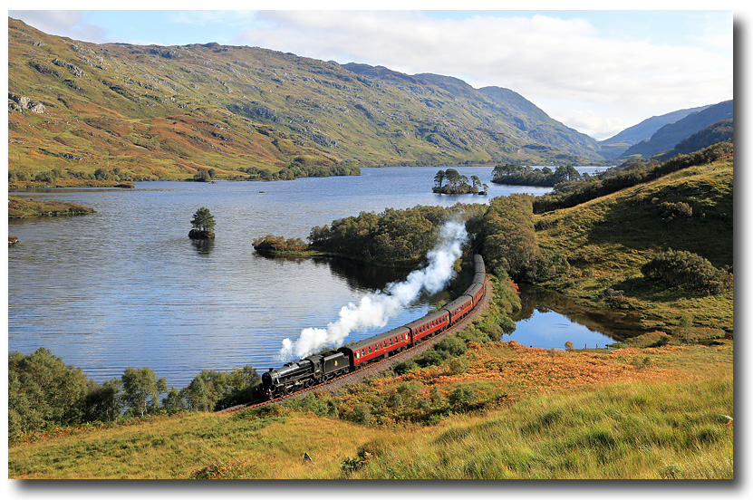 Als der Zug auf dem Damm am Rande des Loch Eilt vorüberzieht,
