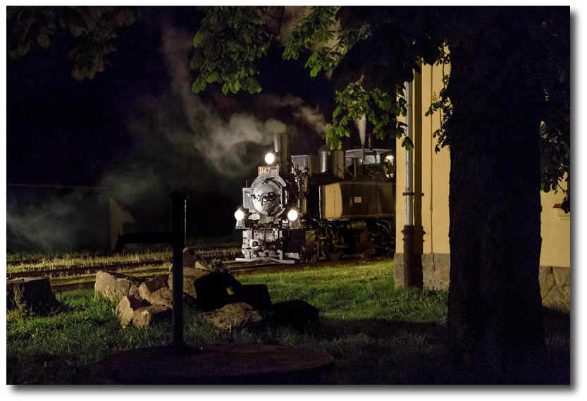 Schmalspurromantik-Pur: Abwarten einer nächtlichen Kreuzung. Jindřichohradecké místní dráhy (JHMD), Südböhmen. 26.4.2014