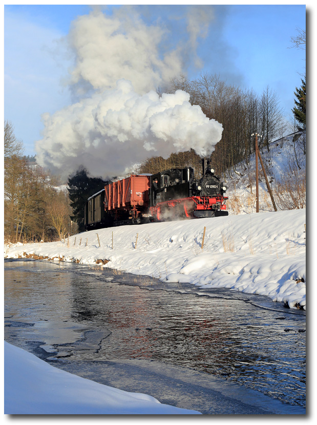 Erzgebirg'scher Winterzauber: Mit einem historischen GmP dampft die IVk hinter Steinbach das Preßnitztal hinauf. 7.2.2015. Mehr zu Winterdampf im Erzgebirge hier.
