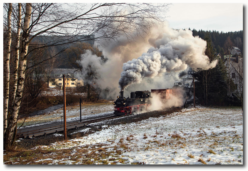 Mit einem Epoche-III-Rollwagenzug dampft 99 590 bei Schmalzgrube durchs Pressnitztal und räuchert dabei den ganzen Ort ein.