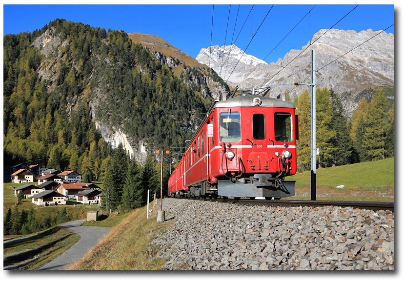 Das Jubiläum 20 Jahre Club 1889 brachte interessante Fahrzeugeinsätze auf die RhB. Einer der schönsten Züge war der "Fliegende Rhätier" mit dem ABe 4/4 501. Preda, 16.10.2016.